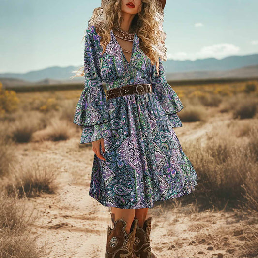 Women's Printed Fashionable V-neck Bohemian Long Dress