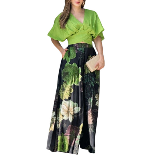 Casual V-neck Printed Short-sleeved Top Loose Wide Leg Pants 2-piece Set