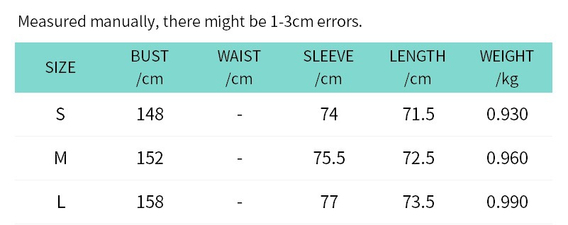 1. Asian sizes are 1 to 2 sizes smaller than European and American people. Choose the larger size if your size between two sizes. Please allow 2-3cm differences due to manual measurement. 2. Please check the size chart carefully before you buy the item, if you don't know how to choose size, please contact our customer service. 3.As you know, the different computers display colors differently, the color of the actual item may vary slightly from the following images.