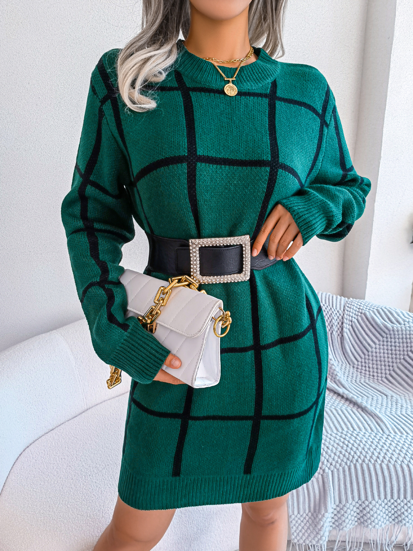 Casual Color Block Plaid Long Sleeve Sweater Dress