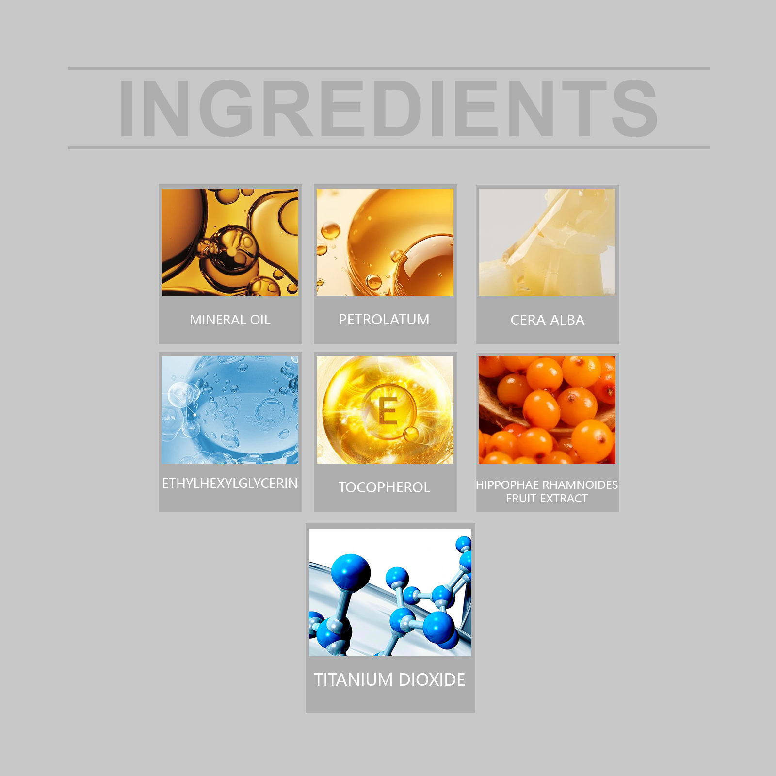 Ingredients: mineral oil, petrolatum, white beeswax, ethyl hexyl glycerol, vitamin E (tocopherol), titanium dioxide, sea buckthorn sea buckthorn extract