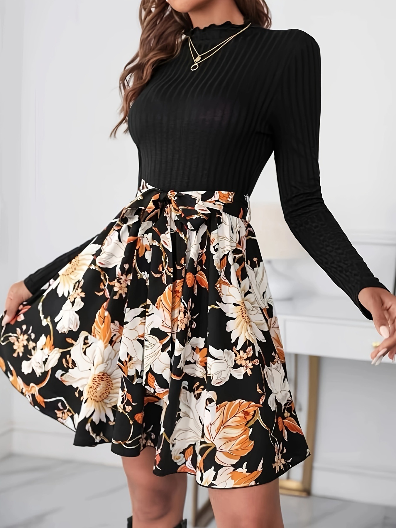 Long Sleeve Round Neck Belt Dress Fashion