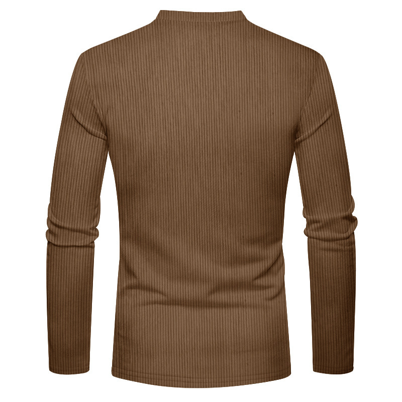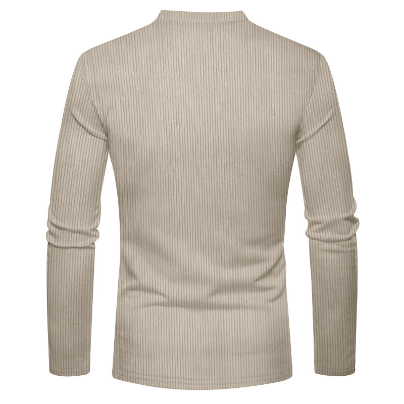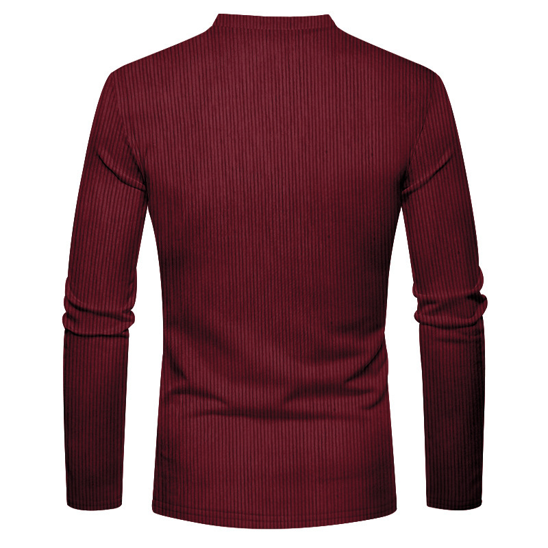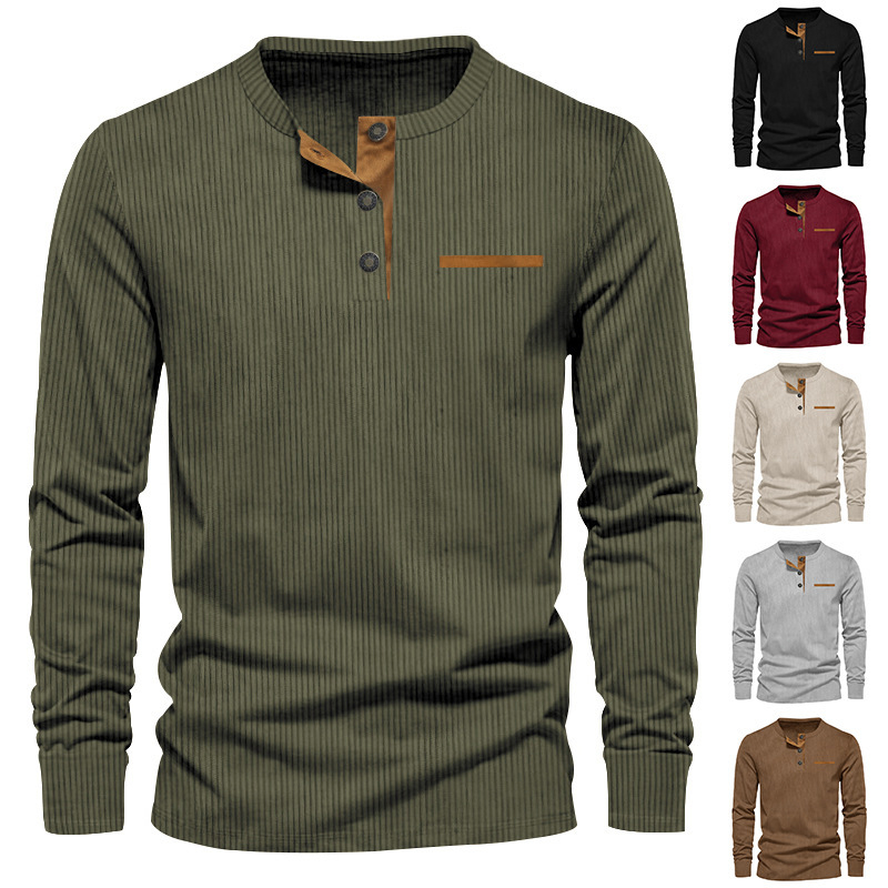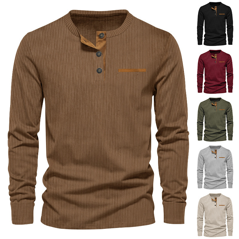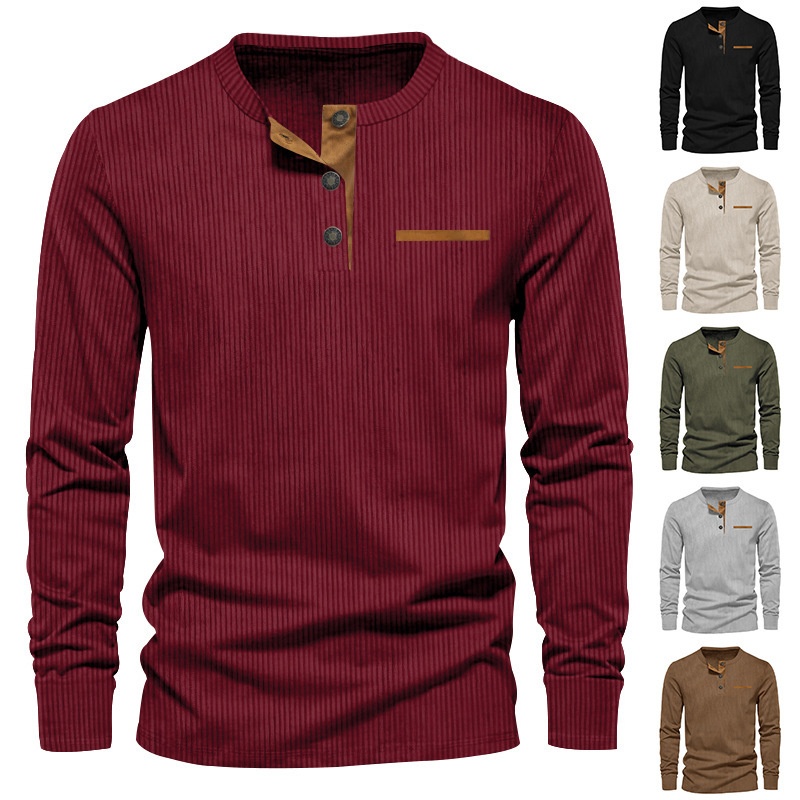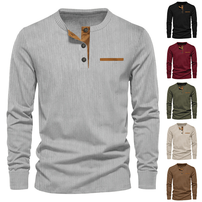 Men's Independent Stand Corduroy Casual Henley Slim Solid Color Long Sleeve T-shirt