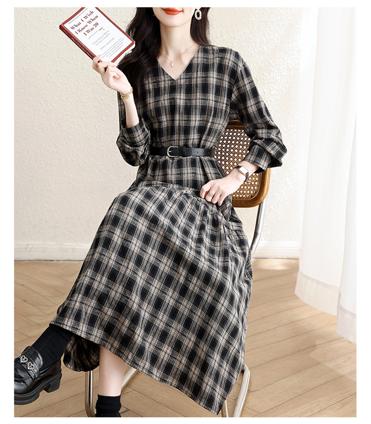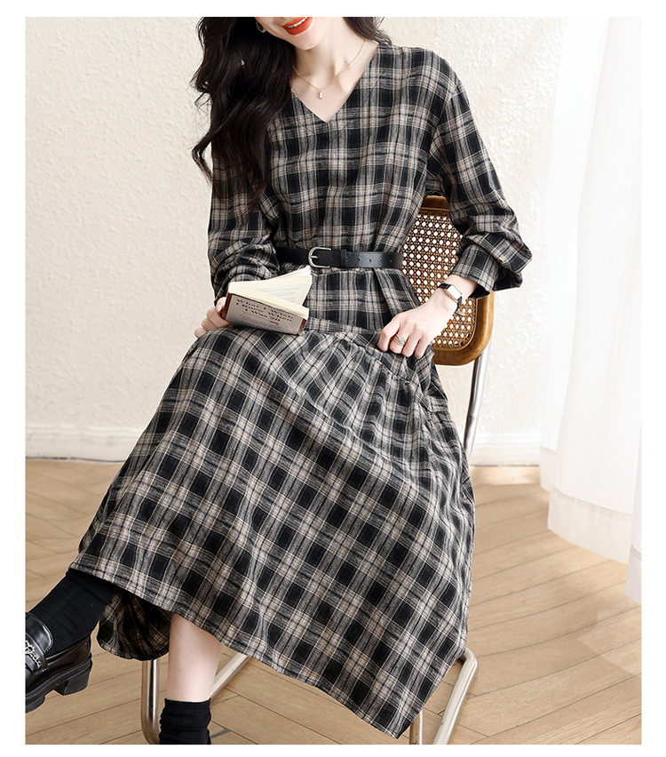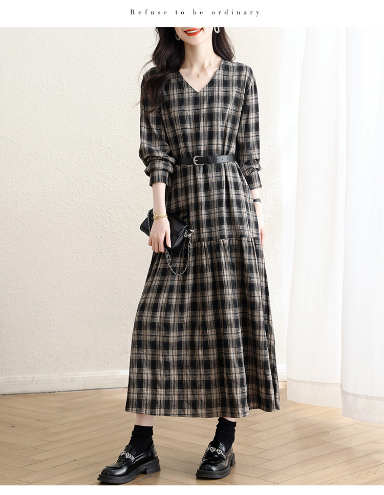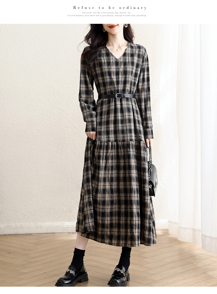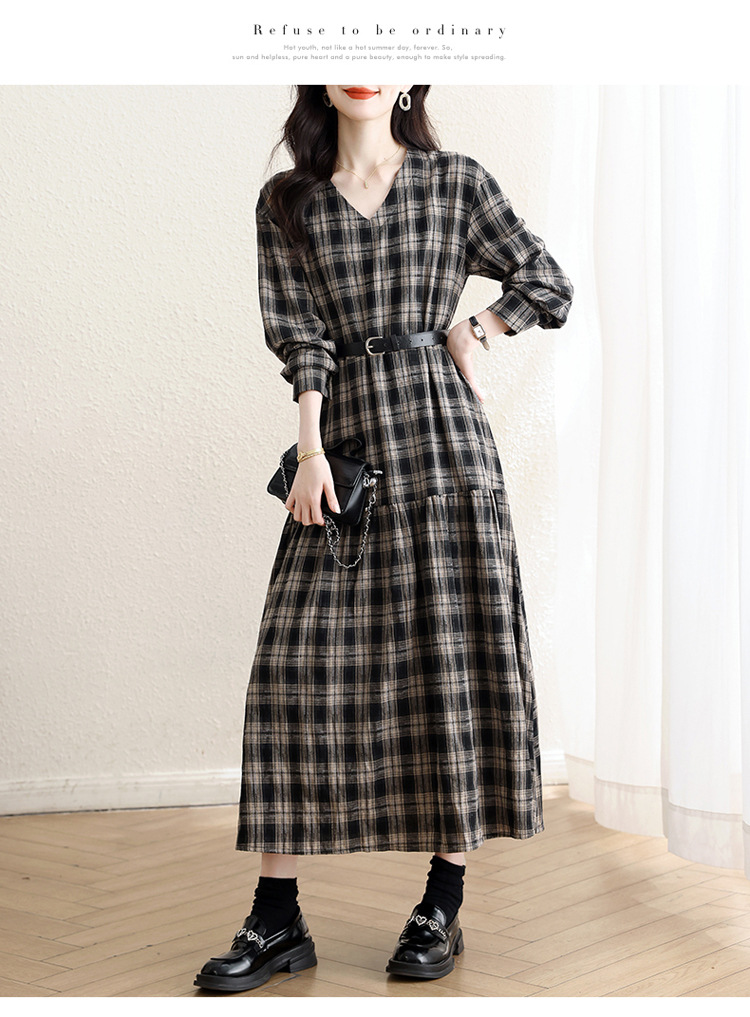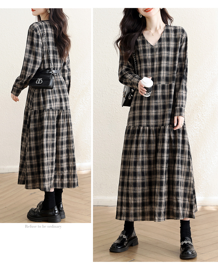 Retro Ruffle Design V-neck Plaid Loose Dress