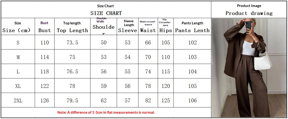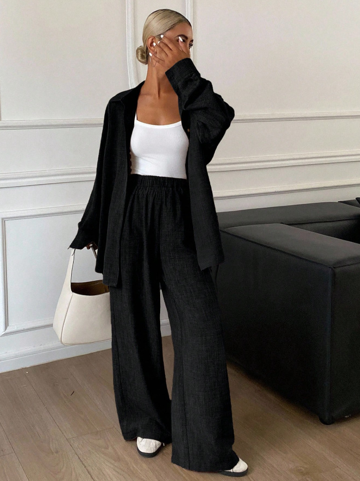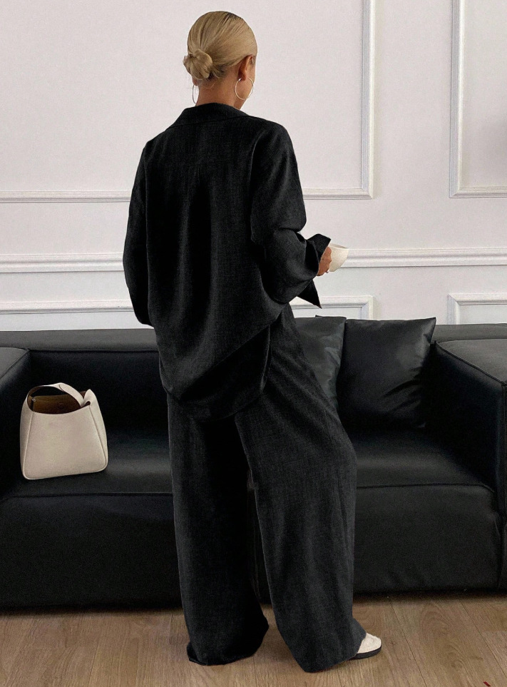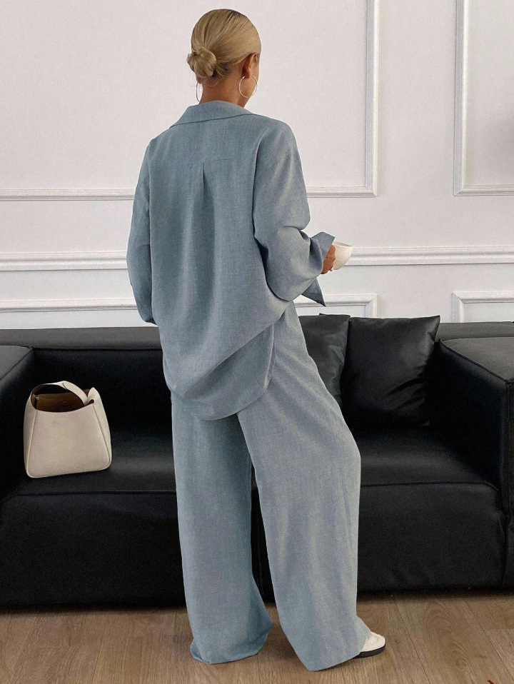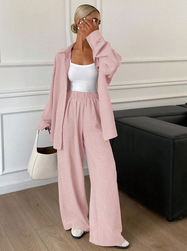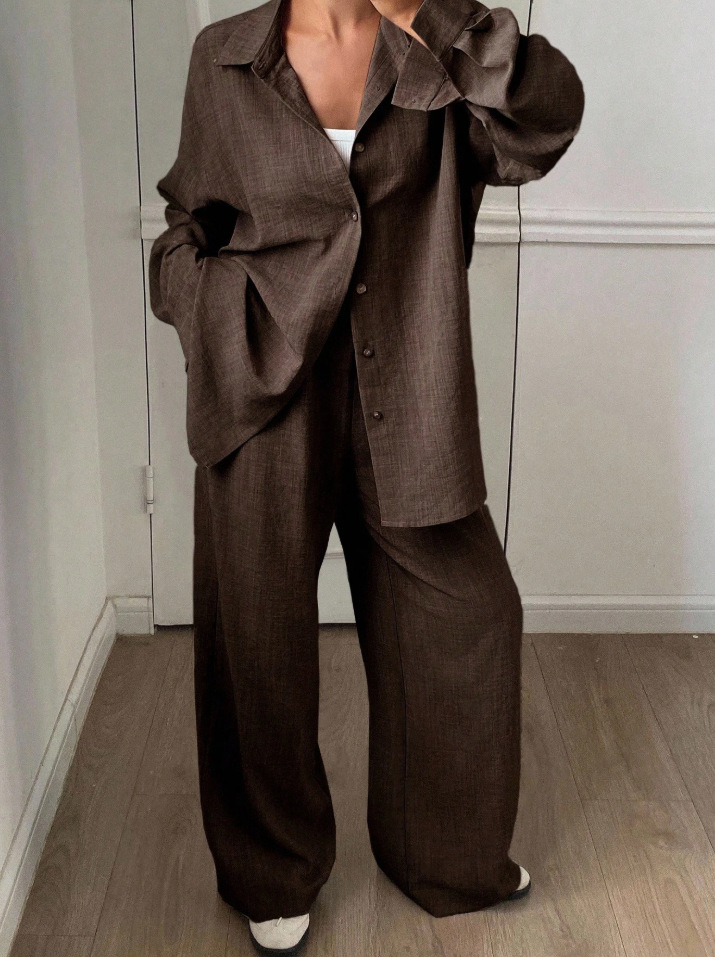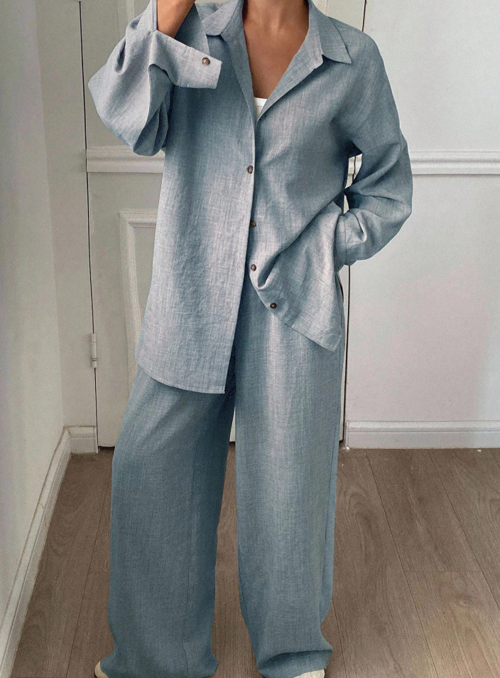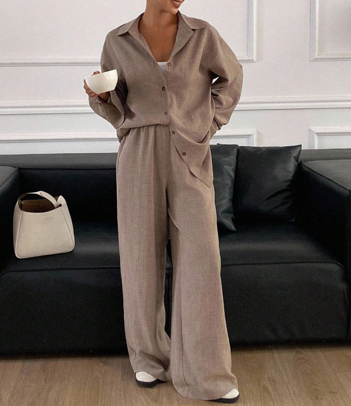 Womens Solid-Color Casual Loose Cotton-Linen Long-Sleeve Shirt And Pants Set