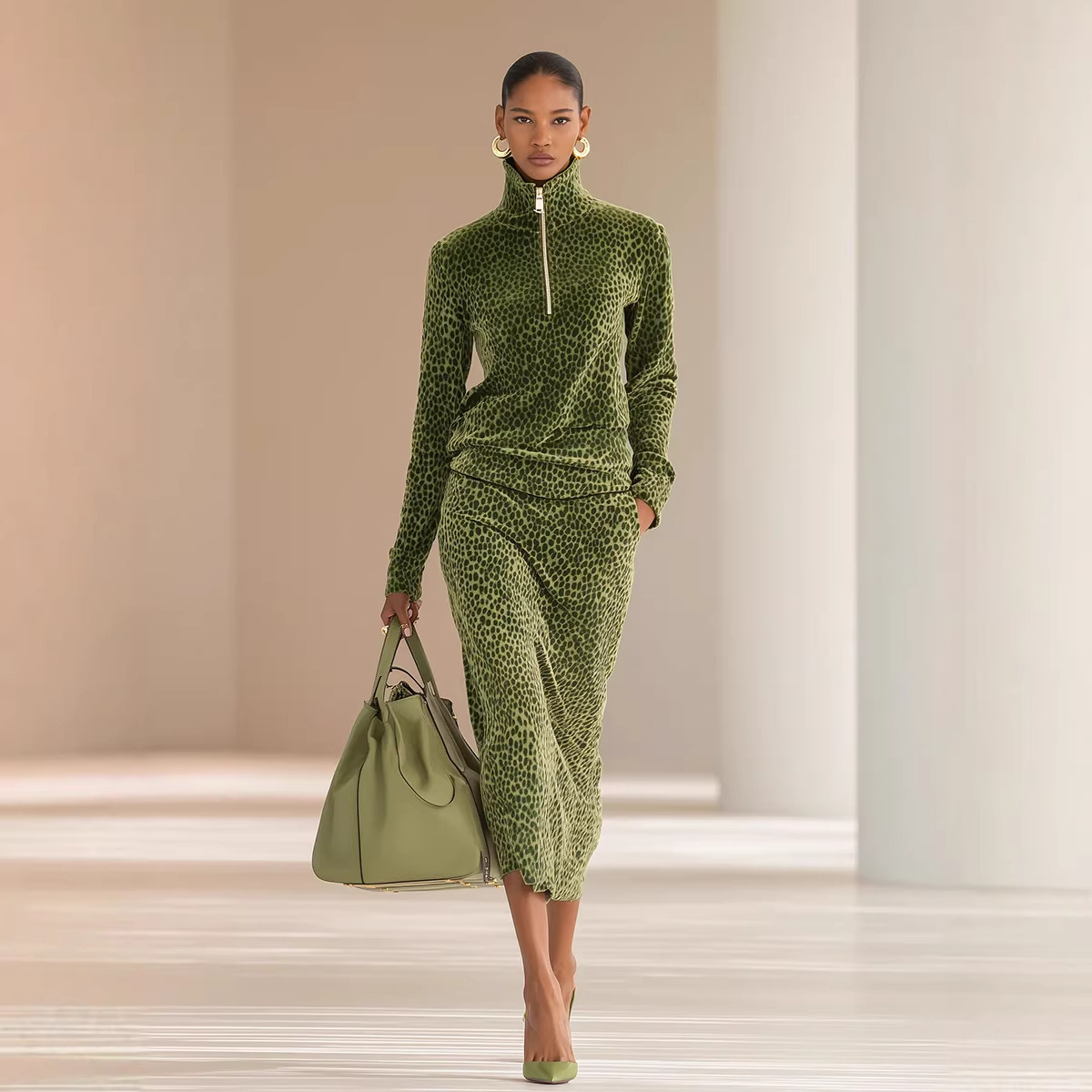 Womens Sporty Leopard-print Stand-collar Long-sleeve Top And Skirt Two-piece Set